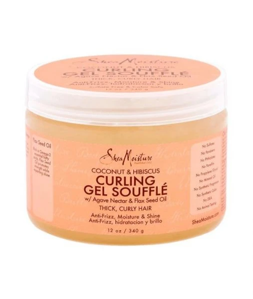 SheaMoisture Coconut & Hibiscus Curling Gel Soufflé is blended with certified organic Shea Butter, another naturally rich ingredient that delivers instant hydration to dry, over-processed curls. This curling gel for hair is enriched with Flax Seed Oil, which helps to strengthen your hair, whether it has natural loose curls or tighter kinky curls.
