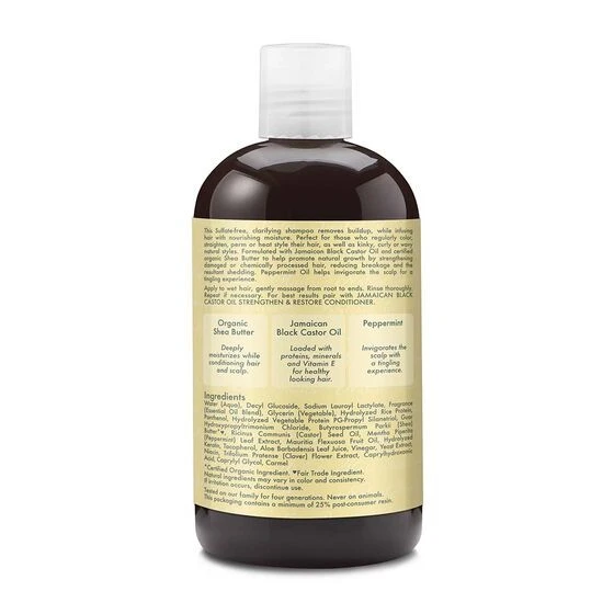 This Sulfate-free, clarifying shampoo removes buildup, while infusing hair with nourishing moisture. Perfect for those who regularly color, straighten, perm or heat style their hair, as well as kinky, curly or wavy natural styles. Formulated with Jamaican Black Castor Oil and certified organic Shea Butter to help promote natural growth by strengthening damaged or chemically processed hair, reducing breakage and the resultant shedding. Peppermint Oil helps invigorate the scalp for a tingling experience.